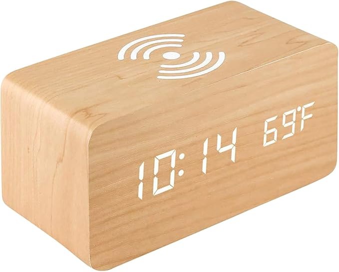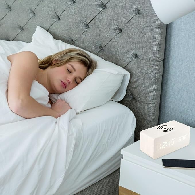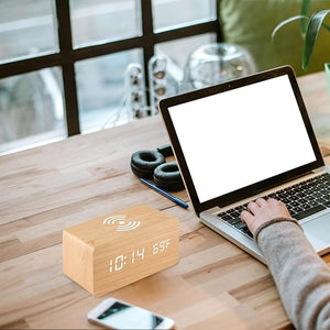 Empieza el día con estilo y comodidad con este reloj despertador que integra función de carga inalámbrica. Su diseño minimalista en madera lo convierte en un accesorio ideal para cualquier espacio. Disponible en dos colores.