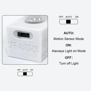 Modos Ajustables: Ofrece tres modos de operación: Auto, On y Off. En modo Auto, se activa con el sensor; en modo On, permanece encendida; y en modo Off, se apaga completamente.