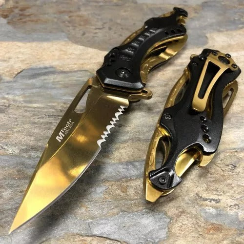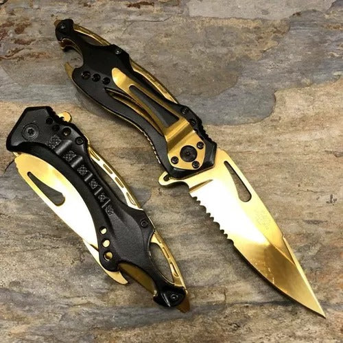 Combina elegancia y funcionalidad con esta navaja semiautomática dorada, ideal para uso diario, actividades al aire libre y situaciones de emergencia.